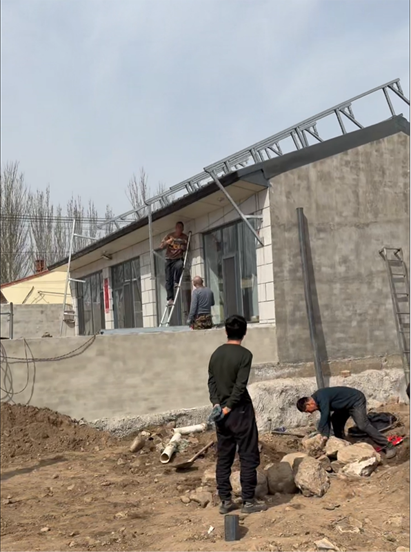 • Систематически возводился стальной каркас крыши. Строители использовали лестницы для регулировки опорной системы на крыше фермерского дома, закладывая прочный фундамент для последующей установки ФЭ-модулей.