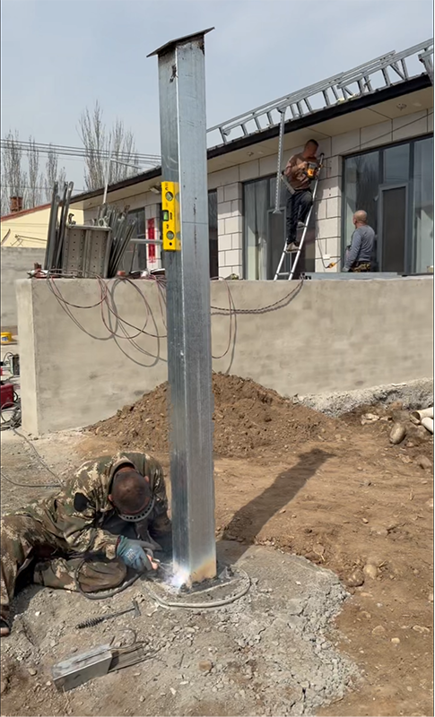 • Одновременно шли заливка фундамента и установка колонн. Рабочие точно сваривали и фиксировали горячеоцинкованные колонны, обеспечивая стабильность и долговечность опорной конструкции ФЭ-станции с помощью таких процессов, как калибровка уровня и тонкая шлифовка сварных швов.